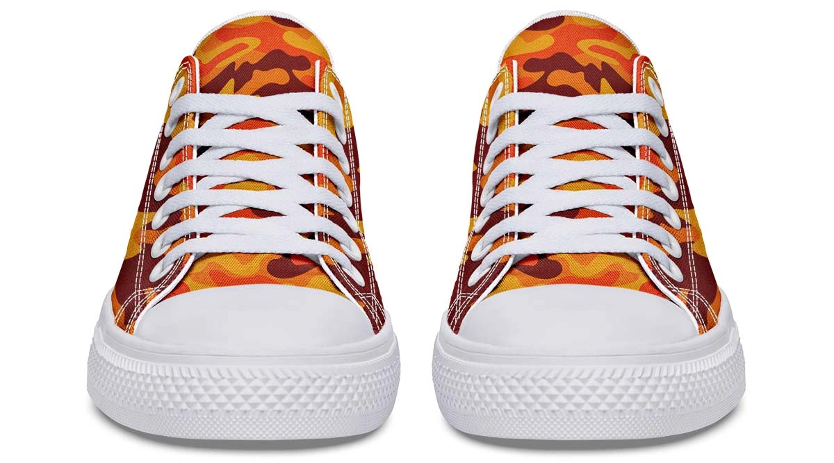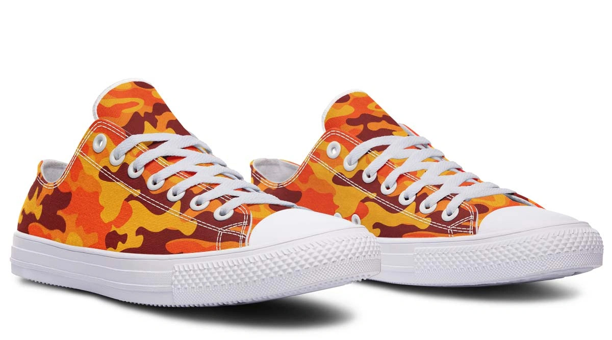 Upgrade your footwear collection with our Orange Camo Pattern White Low-Top Sneakers. These sneakers combine a vibrant orange camouflage print with a clean white base, creating a bold statement for any outfit. Engineered for durability and all-day comfort, the lightweight design ensures breathability whether you are hitting the city streets or meeting friends. Featuring a classic low-profile silhouette and high-quality construction, these fashion-forward sneakers are the ultimate addition to your trendy casual wardrobe.